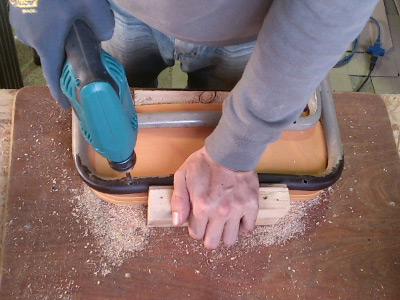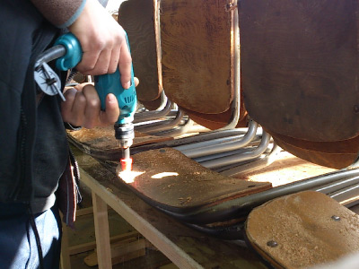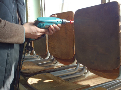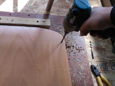 椅子のフレームをガイドに利用し、座板に穴をあける。