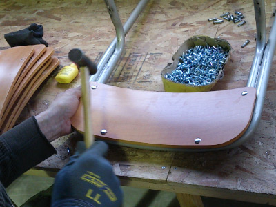 穴あけ後の座板をフレームにセットし、リベットを打ち込む。