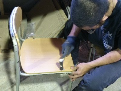 生徒が利用することにより、木製部分である机の天板・椅子の背もたれや台座などが劣化していくのはしかたがないことですが、劣化してしまった天板は取り替えればいいのです。